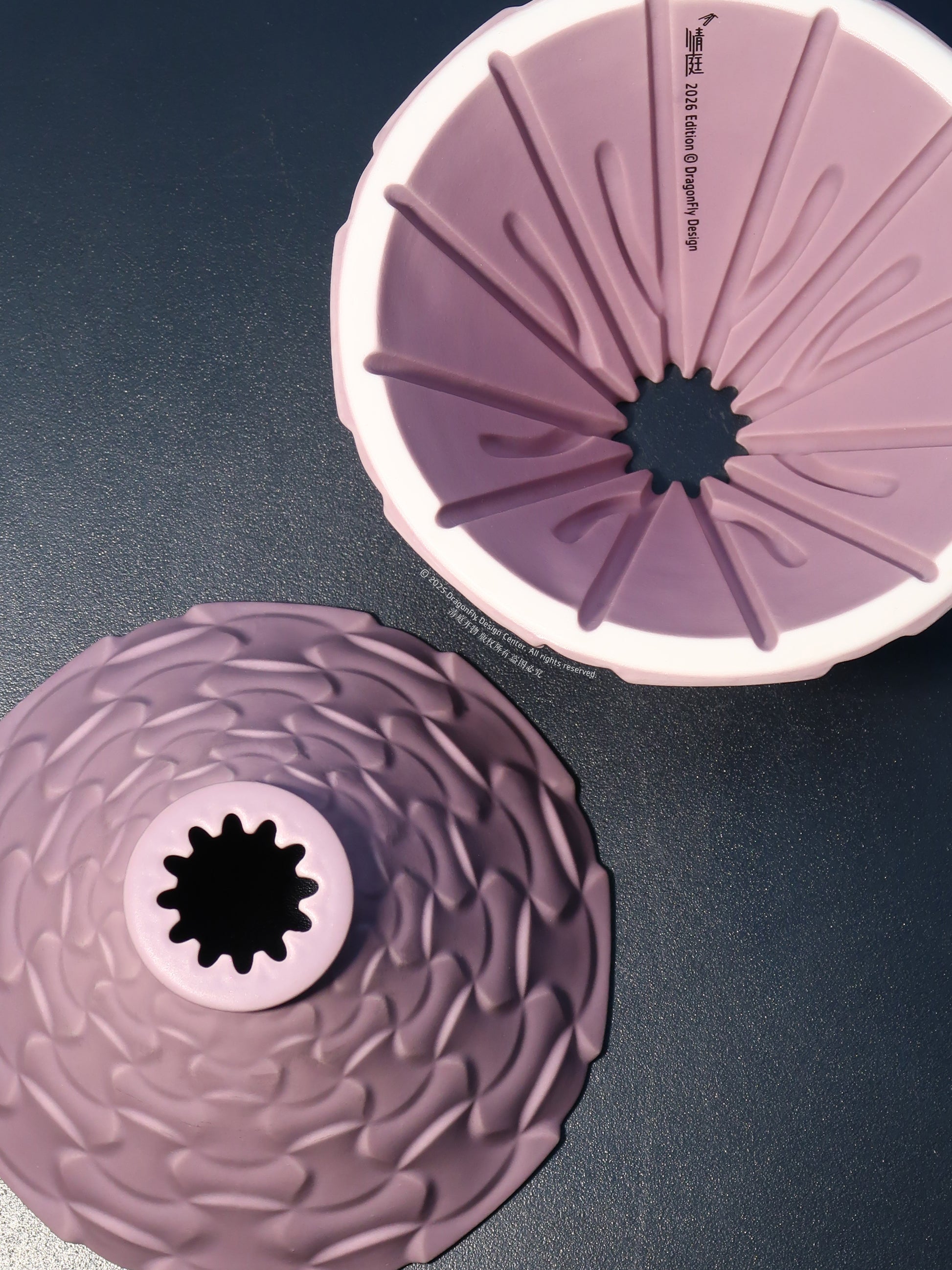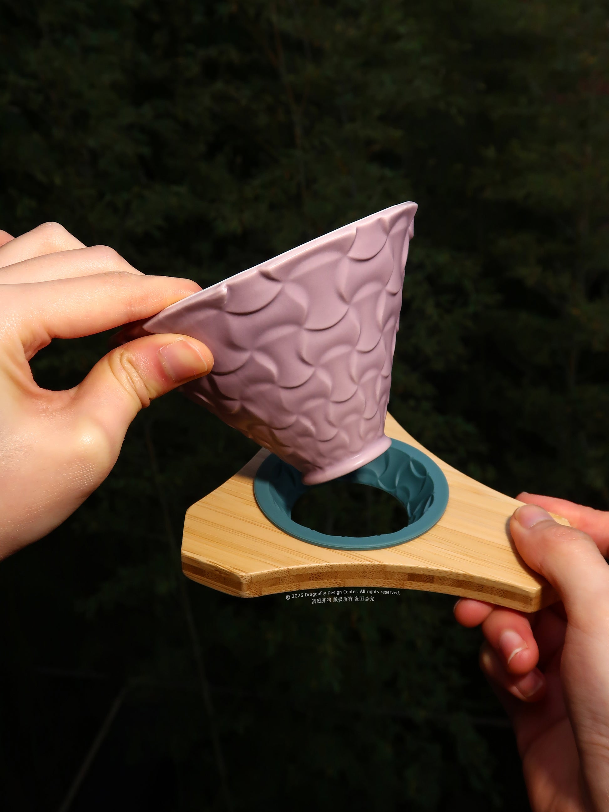 The exterior texture of the saddle dripper is inspired by the saddle shape found in Tang Dynasty tri-color pottery – a three - dimensional, full, and slightly upturned saddle - shaped relief. This design is regularly arranged on the exterior of the dripper using contemporary design language, creating a dialogue with the saddles and horses of the prosperous Tang Dynasty, while also implying a prosperous and successful Year of the Horse. The interior of the dripper features original coral - shaped grooves. Twelve long grooves are evenly distributed, running from the top to the bottom of the dripper. Eight curved, short grooves extend from the long grooves like c oral branches, effectively accelerating the water flow rate and achieving efficient extraction. A ring is located at the bottom of the dripper, which is compatible with the "Transit switch base.” While enhancing functionality, it also implies "perfection."